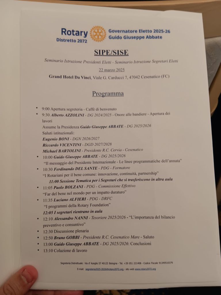 Mattinata rotariana al Grand Hotel Da Vinci a Cesenatico come Presidente a.r. 2025/206 del Rotary Eclub Distretto 2072. La formazione è sempre lo strumento vincente per guidare i processi di cambiamento e generare bene per tutti. Viva il Rotary