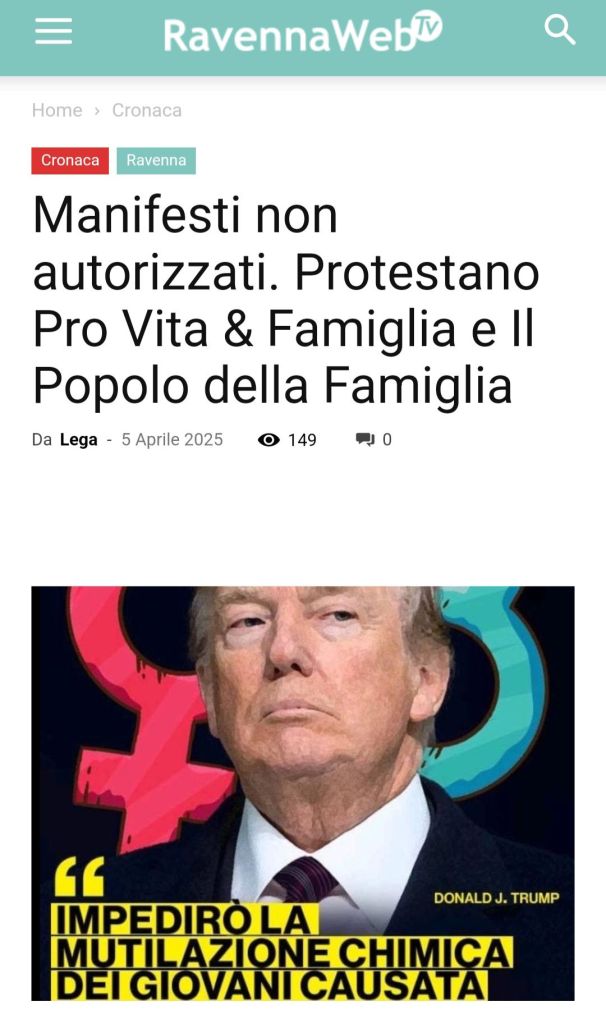 A Ravenna accade anche questo: la società pubblica Ravenna Entrate nega all’associazione ProVita e Famiglia di affiggere la campagna di manifesti contro il gender che richiama all’ordine esecutivo firmato dal Presidente Trump. Se non la pensi come loro non puoi rendere pubbliche le tue opinioni. E poi dicono che non devi permetterti di chiamarli ancora comunisti… #comunali #ravenna #Lega #PopolodellaFamiglia #ListaPerRavenna #ancisisindaco