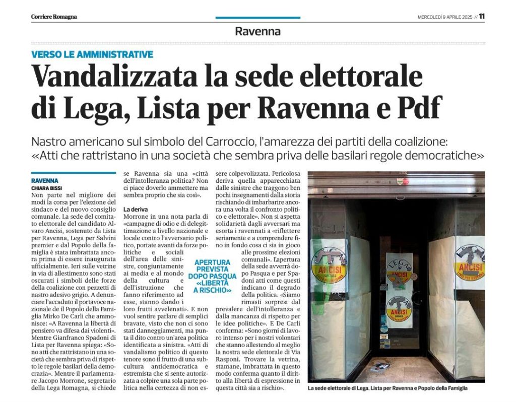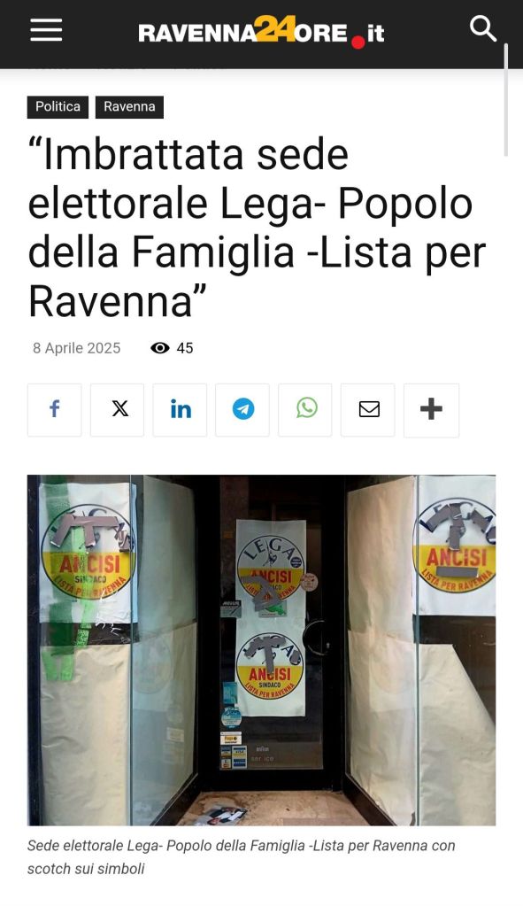 La democrazia si pratica non si professa: purtroppo a Ravenna ancora questo messaggio non è chiaro per alcuni. Il silenzio assordante di chi amministra la città e di alcuni che vorrebbero definirsi opposizione ma, a fatti, lo sono di rado conferma il clima da curva calcistica di questa campagna elettorale: la nostra sede, a pochi passi da Palazzo Merlato, imbrattata ne è la conferma plastica. Per alcuni meglio un applauso a Carlo e Camilla, molto meglio per non dire altro #comunali #Ravenna #Lega #PopolodellaFamiglia #ListaPerRavenna #ancisisindaco