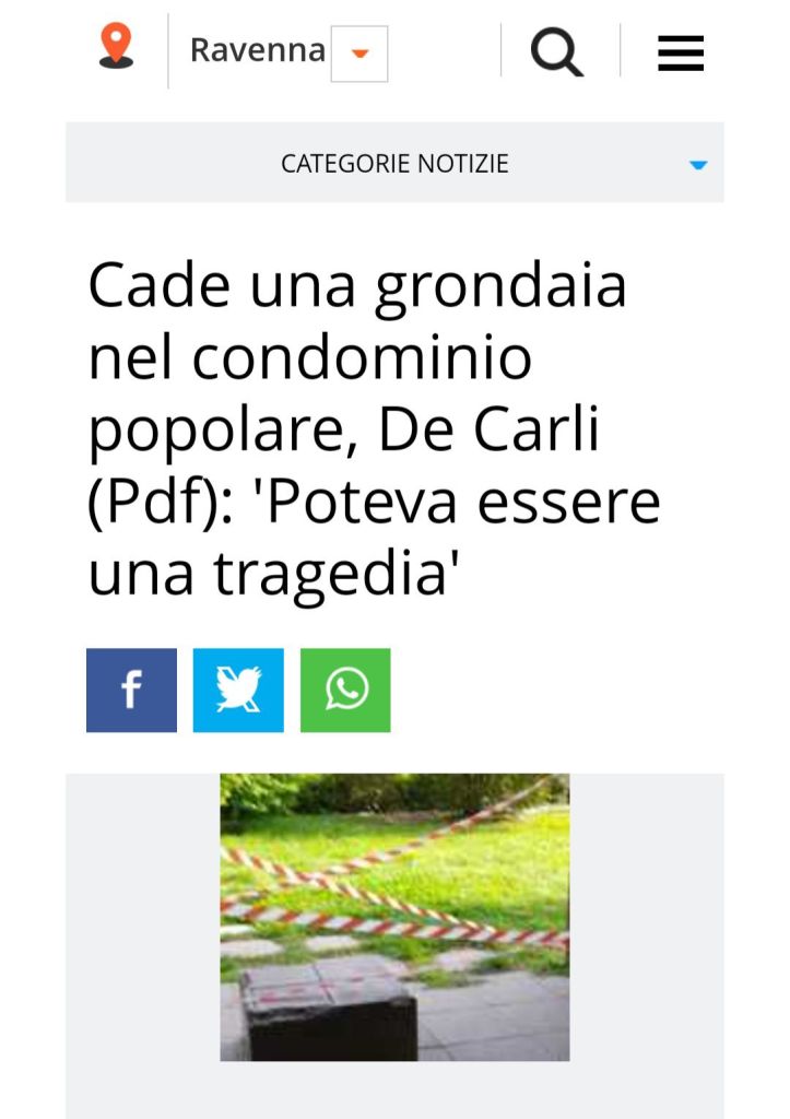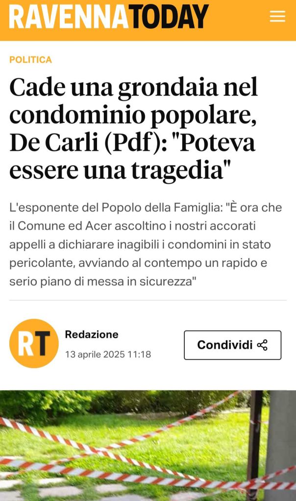 Si è sfiorata la tragedia nel silenzio assordante dell’amministrazione comunale: in un condominio delle case popolari di Via Eraclea è caduta una grondaia e ora l’area è posta sotto divieto di circolazione. Grazie a Dio nessuno era di passaggio durante la caduta ma se invece ci fosse scappato il ferito o peggio ancora il morto? Il Comune ed Acer ne sarebbero stati direttamente responsabili. Per questo motivo il nostro piano per mettere in sicurezza questi immobili è prioritario più che mai #comunali #Ravenna #Lega #PopolodellaFamiglia #ListaPerRavenna #ancisisindaco
