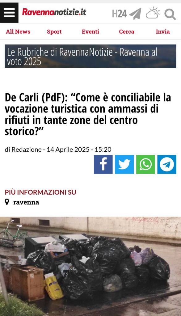 L’amministrazione comunale si riempie la bocca di vocazione turistica della città e poi ogni giorno siamo travolti da immagini di montagne di rifiuti a terra in centro storico. C’è qualcosa che non va con l’attuale sistema di raccolta dei rifiuti, lo volete capire o no? #comunali #ravenna #Lega #PopolodellaFamiglia #ListaPerRavenna #ancisisindaco