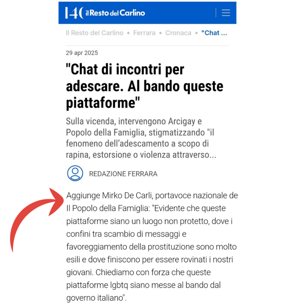 La morte di Alessandro Coatti è una tragedia che richiede la massima fermezza nel condannare quei luoghi del male che ne hanno creato le condizioni. Per questo, esprimendo il massimo cordoglio alla famiglia, come Popolo della Famiglia chiediamo con forza che vengano messe al bando dallo Stato queste maledette chat per incontri omosessuali. Da anni lo diciamo e da anni, i troppi colpiti da queste piattaforme, meritano una risposta forte da parte delle istituzioni