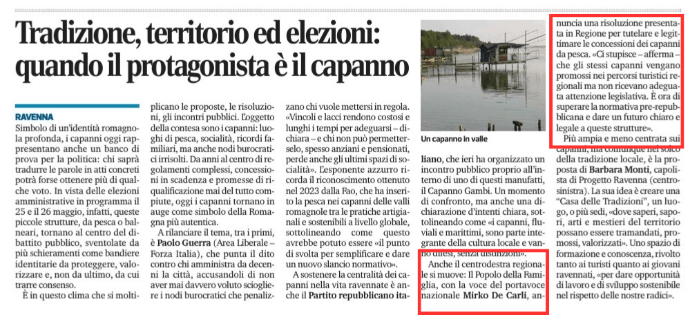 “Grazie al lavoro del nostro consigliere regionale Tommaso Fiazza del gruppo consiliare regionale Lega – Popolo della Famiglia abbiamo presentato una risoluzione per arrivare all’obiettivo prioritario di salvaguardare i capanni da pesca come patrimonio dellla nostra terra. Ci meravigliamo del perché la sinistra di governo cittadino e regionale non abbia ancora attivato alcuna procedura in tal senso: stupisce ancora di più che vengano segnalati dalla stessa regione come punti d’interesse turistico nei percorsi ciclopedoturistici e non abbiamo al tempo stesso le licenze adeguate e a norma di legge” dichiara De Carli (Portavoce nazionale de Il Popolo della Famiglia).
