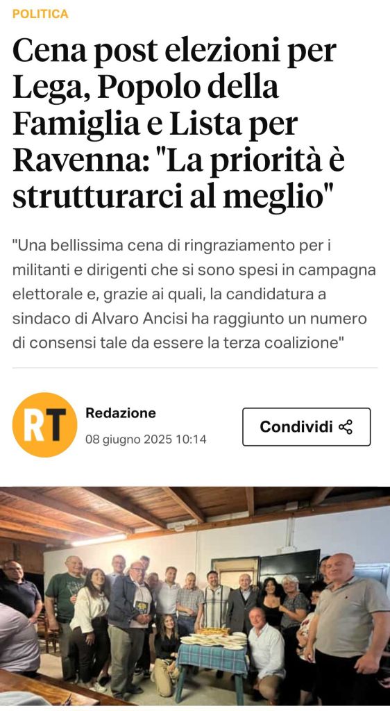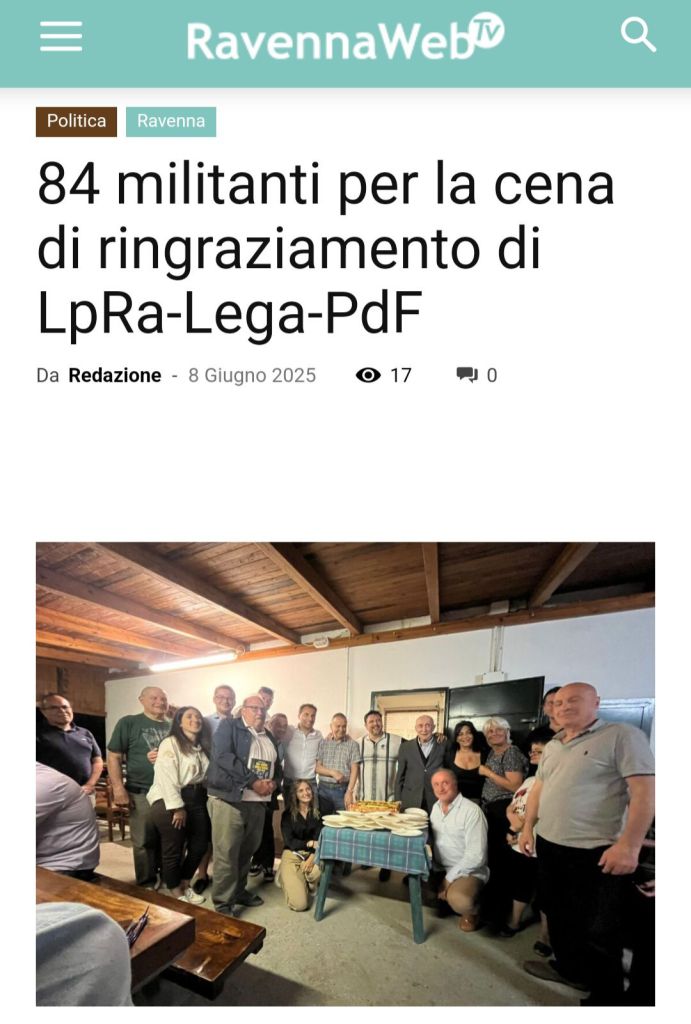 Una bellissima serata in un uno splendido “capanno” sui Fiumi Uniti, tra sorrisi ed un pizzico di sana ironia condita da un’ottima cucina romagnola, che ha confermato la volontà di rafforzare e radicare nel territorio sempre più il risultato elettorale che ci vede, a Ravenna, terza forza politica della città. Le priorità prima della pausa agostana? Avviare l’organizzazione del coordinamento della lista Lega-PdF-LpRa e gettare le basi per un tavolo permanente delle forze alternative alle sinistre.